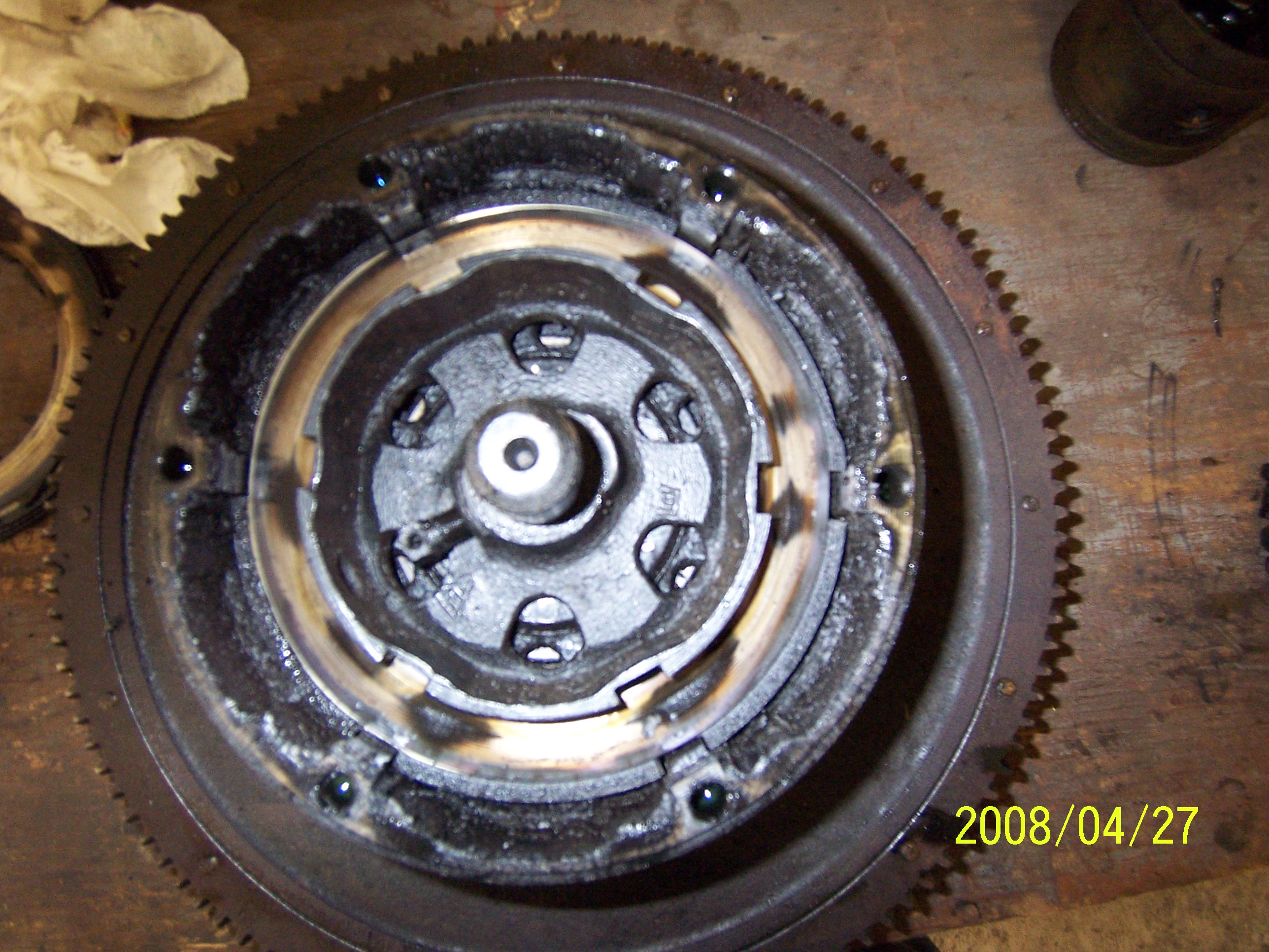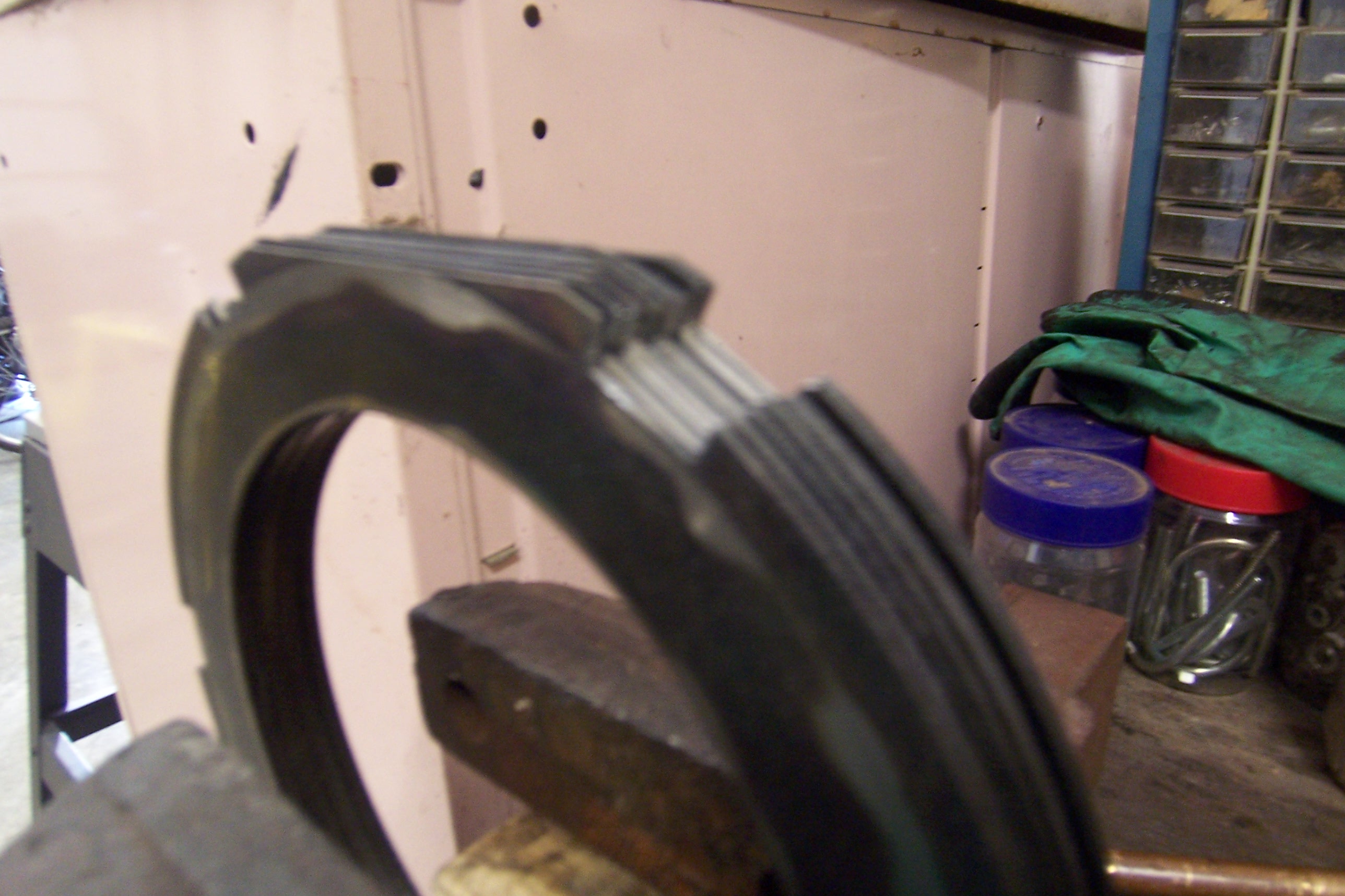 Had to file some more on the drive gear to avoid tearing up the new bushings on reassembly. Then had to punch all the rivets on the reverse and low speed drum because they were loose. Noticed that the Ford Service Manual said to replace the drums in that case, but it was easy enough to hit each one with a punch a time or two. Now the hard part. The clutch ears inside the brake drum were badly chewed. The wider 26 & 27 brake drum had replaceable lugs. At the recommendation of Frank Goepferich, I tediously ground the old ones down so that the 26/27 inserts would fit over them, and set them with Threadlocker Red (High Temperature), which is supposed to be good for 450 degrees. The problem (besides about 12 hours of tedious filing & fitting) is in keeping the lugs square and spaced wide enough that the clutch discs would still fit. After many failed fitting attempts, the clutch disks got ground down when I figured out that they were all different sizes. Now they all fit and move well, with enough play that there should be room for some heat expansion. The flywheel was not disassembled, but ran through the cleaning booth, magnets and all, and right back in to the engine as is. I forgot about the wear on the starter ring gear; fortunately, it doesn't look badly worn.