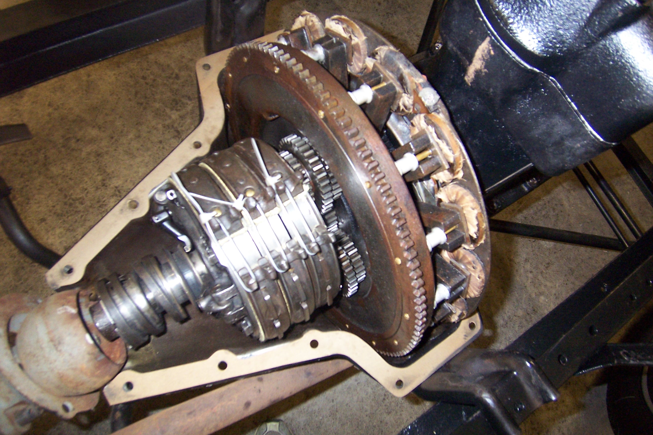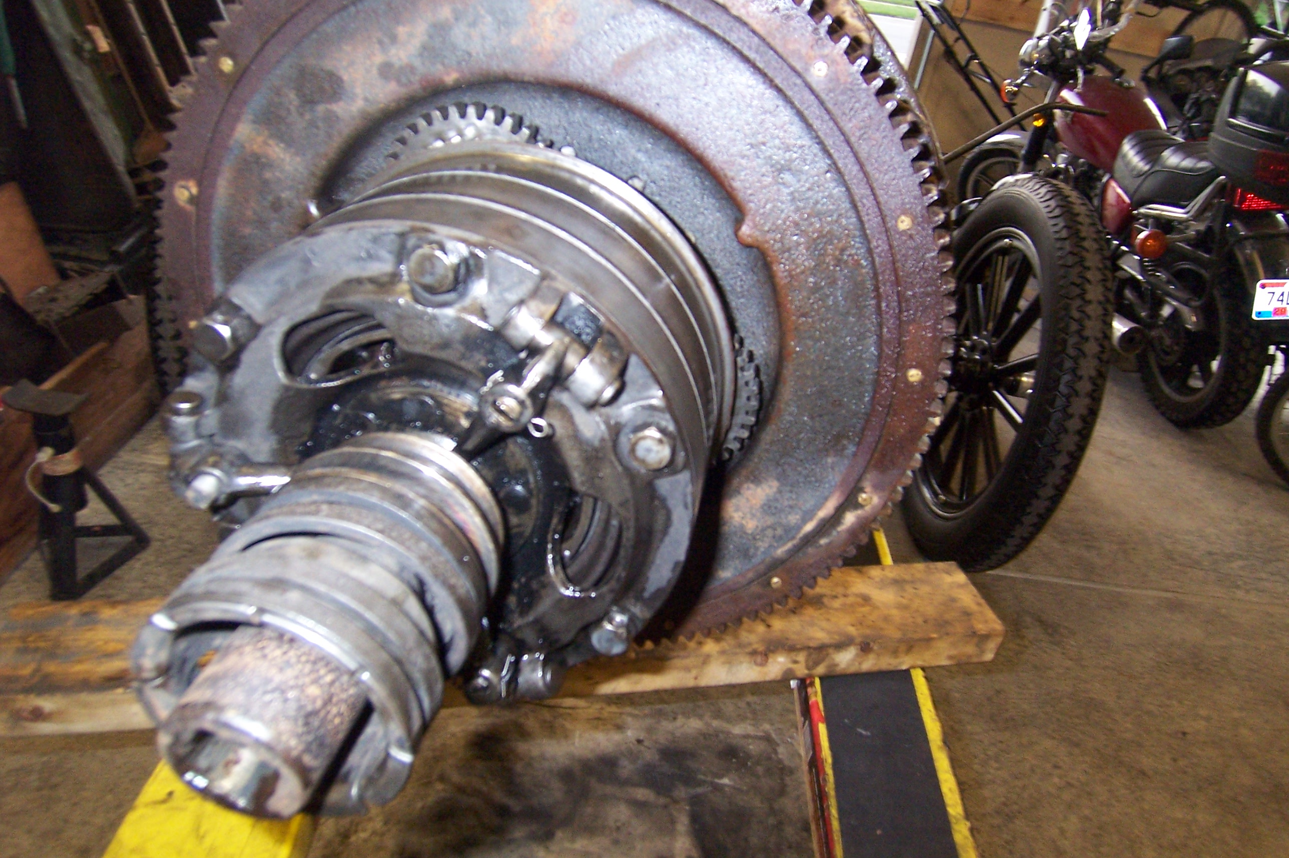 Rod and main bearing Babbitt all looks good, between .002 and .003" according to the Plastigage (that's neat stuff, BTW). However, I kept stripping out rod cap bolts Finally went down to 25 ft/lbs and the rest were okay. Included oil dippers on each rod. The front main got a neoprene seal that is hidden behind half a standard felt seal. Spent a bunch of time puzzling the direction of the wrist pin bolt on the rod - toward or away from the camshaft? Went toward, later, the consensus on the forum agreed, but it's not clear to me what difference it makes. The transmission was a bit trickier. Disassembly wasn't too bad after the acquisition of a new gear puller. The wear on the main drive gear caused a burr that had to be filed down in order to separate the reverse and low speed drum. Then the stack went down to Automotive Machine Shop & Parts on Dayton-Xenia road to pop and press all the bushings (except the drive plate; it was good, fortunately, because Mac's and Lang's were both backordered on replacements for it).