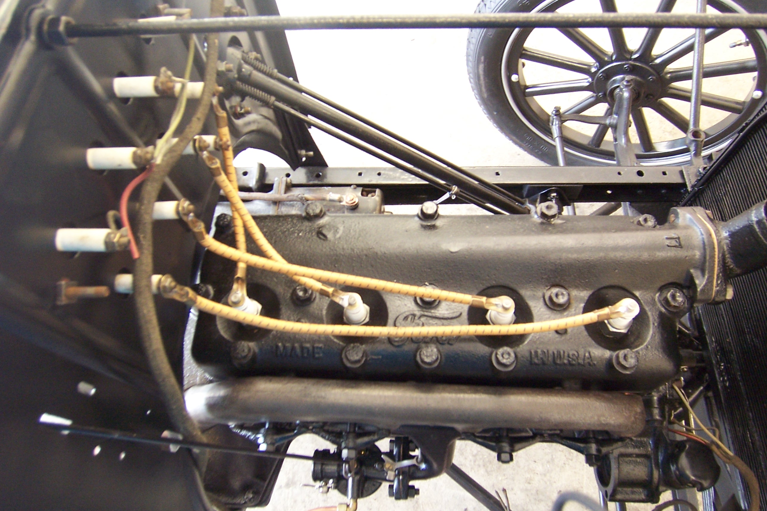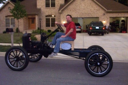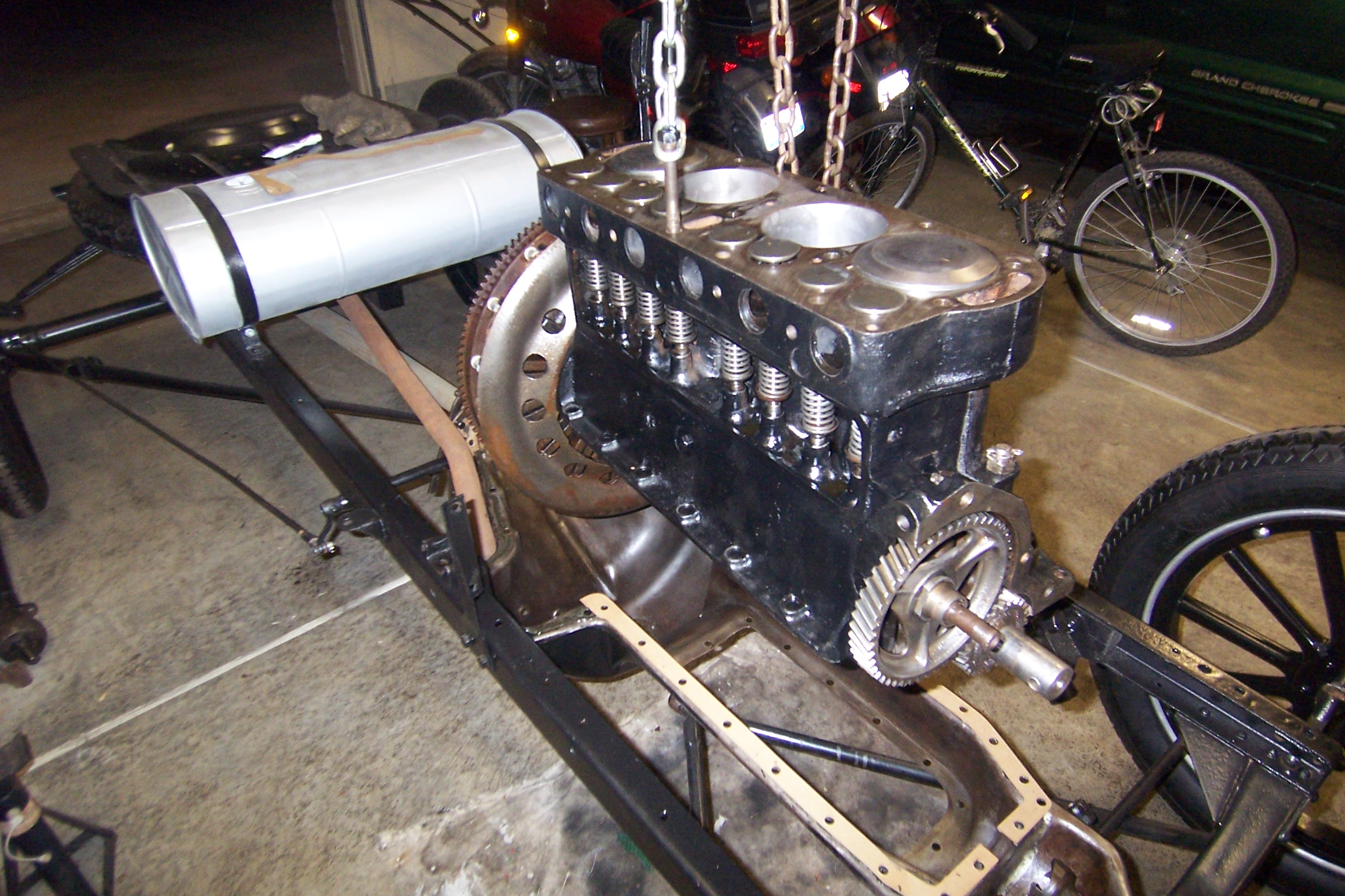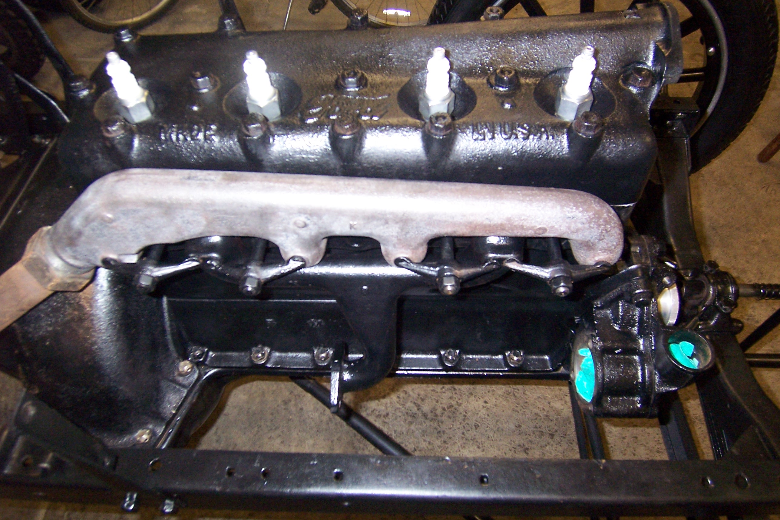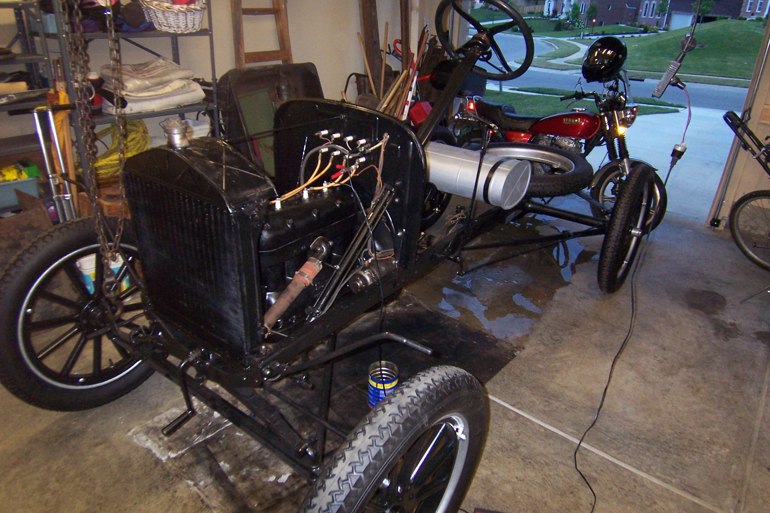 June 22, 2008: It's ALIVE! Okay, lots of other little things happened, but the current situation is that I started my 23 T engine last night for the first time in 27 years. It was amazing how easy it started with the crank (starter doesn't work yet). After slow cranking to test the coils and carb, three pulls is all it took. And I could tell it was running, because it was leaking gas, oil, water and exhaust :-) I haven't given up on bringing it to the Centennial Celebration as a running chassis. It's already registered. All I need is a driveshaft. 7/18/08: Model T's don't leak, they mark their territory... The oil leaks when running are substantial. I tried John Regan's Shop Vac trick with great success. By sticking the hose in the oil filler hole while blowing, soapy water would reveal all the leak points. Switching from blow to suck, a spray can of brake cleaner was used to clean up oil at the leak, and Permatex RTV Black applied. The vacuum pulled the RTV in under the gasket. I fixed three leaks this way, but still ended up pulling the hogshead back off because it leaked so bad. Now it's really tight, and the only leak is a minor one around the pedal shafts. 7/19/08: It moves! I drove the chassis around