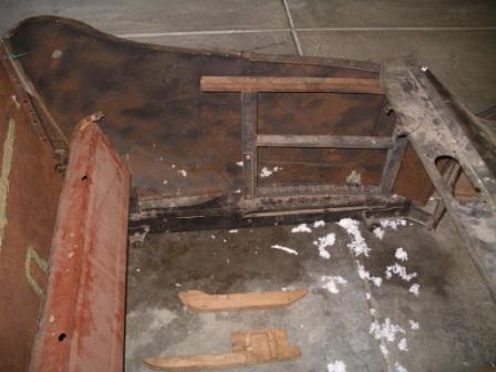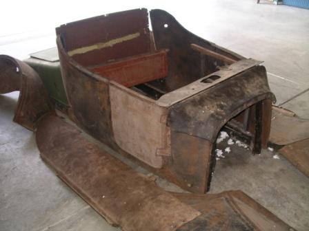 When complete, the car should be a reasonably correct late '23 (sometimes called a 'High hood' '23) two-seat Runabout, with optional electric starter and demountable 'clincher' rims. The reason for the 2nd rebuild of the rear axle? I drug it around for 20 years after the first rebuild, and while in storage the last year, somehow water got in to the diff housing. Fortunately, the damage was minor. I cleaned it out, polished up a few parts, re-greased and reassembled it. The plan from here out is to drop in the original sawmill engine, with the short block untouched. It was running well enough when pulled. Besides, it's loose enough that I can still crank it by hand.:-) All the external parts will be rebuilt (carburetor, starter, generator, coils, etc.) and new gaskets installed all the way around. With the addition of a simple temporary wooden seat over the gas tank (design copied from photographs of chassis being driven around the Ford plant), I'll have a 'running chassis' of the sort that was sold to custom truck body builders. Phase 2? Learn body work. Here's what I have to start with. Fortunately, much of the wood has been replaced already.